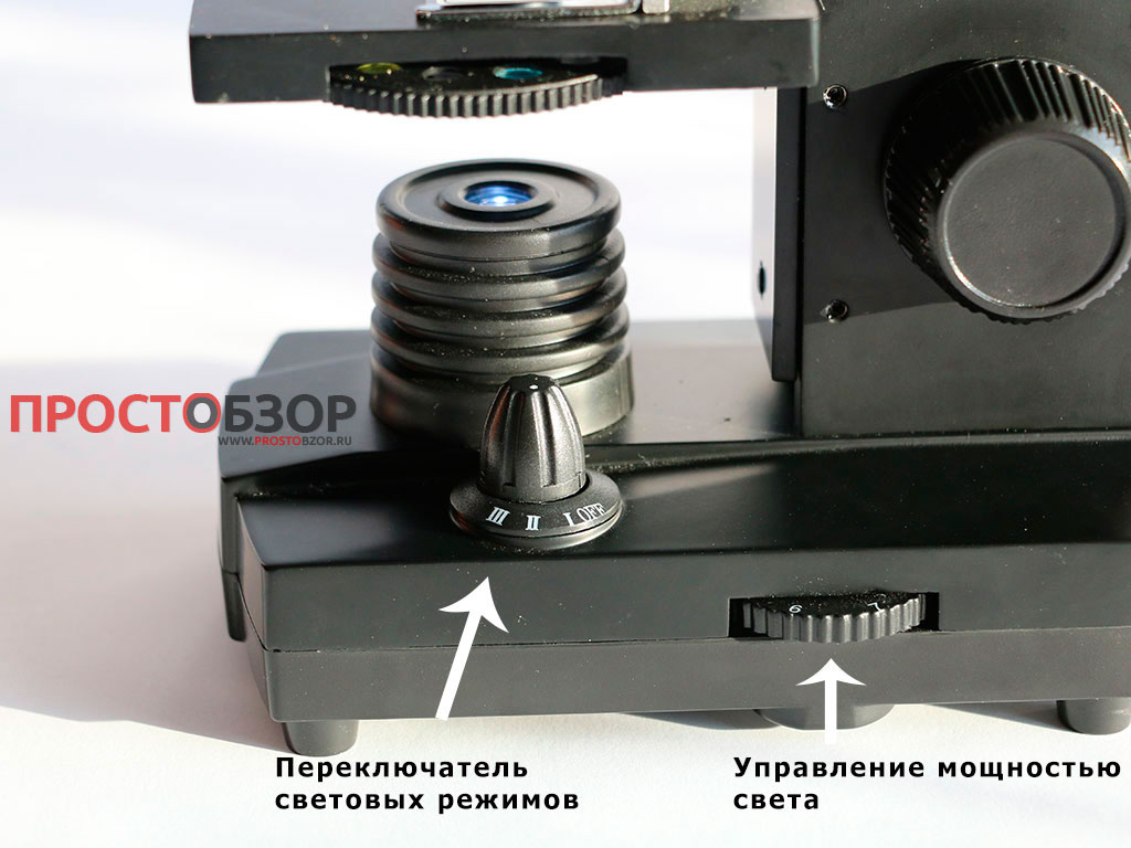 Переключение всех режимов доступно на нижнем переключатели, который расположен в основании микроскопа.