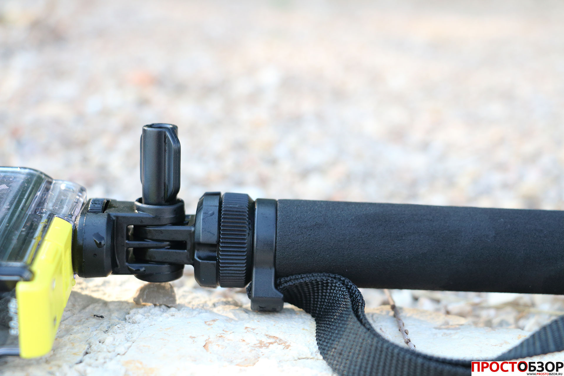 Приложите экшн-камеру к болту и покрутите колесиков — и через пару секунд камера уже закреплена.Дополнительно на моноподе есть фиксатор, который позволяет менять угол съемки камеры, находясь на моноподе.Фиксация колен монопода происходит прокручивания колена относительно от друго, т. к. дополнительных зажимов тут нет.Чтобы случайно не уронить монопод с экшн-камерой — предусмотрен фиксирующий ремень. Он крепится на подвижном кольце. Это позволяет вам не запутать ремень на руке. Достаточно интересное решение.