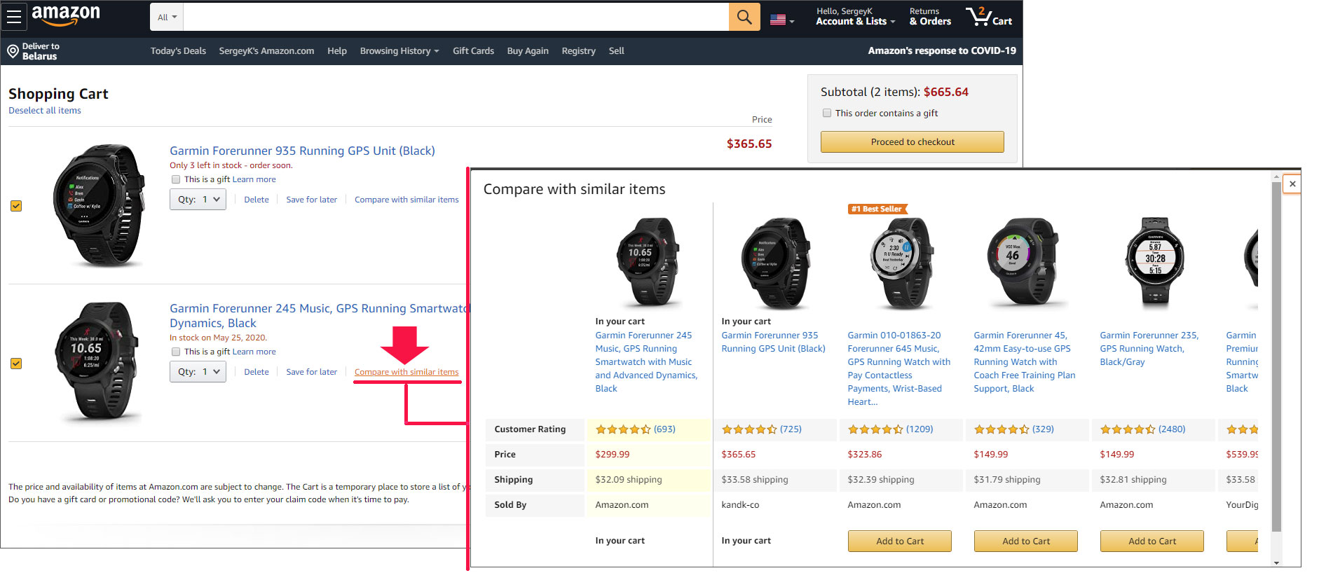 Делайте сравнения — Сравнивайте или подбирайте модели с помощью сервисов Amazon. Добавьте 1-2 товара и откройте Корзина, где уже находятся ваши часы. Выберите из опций товара опцию «Compare with similar items».