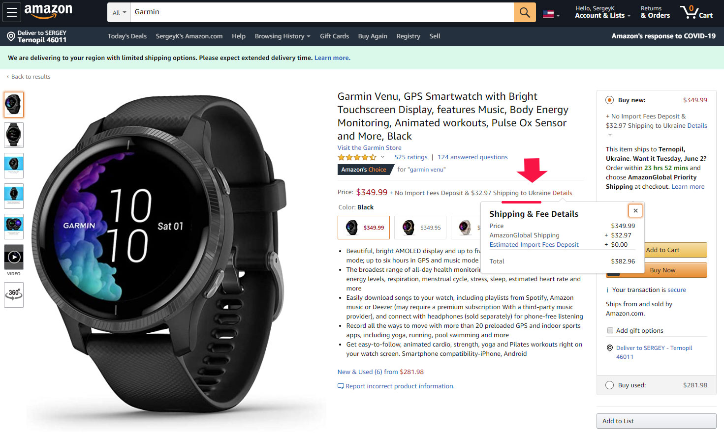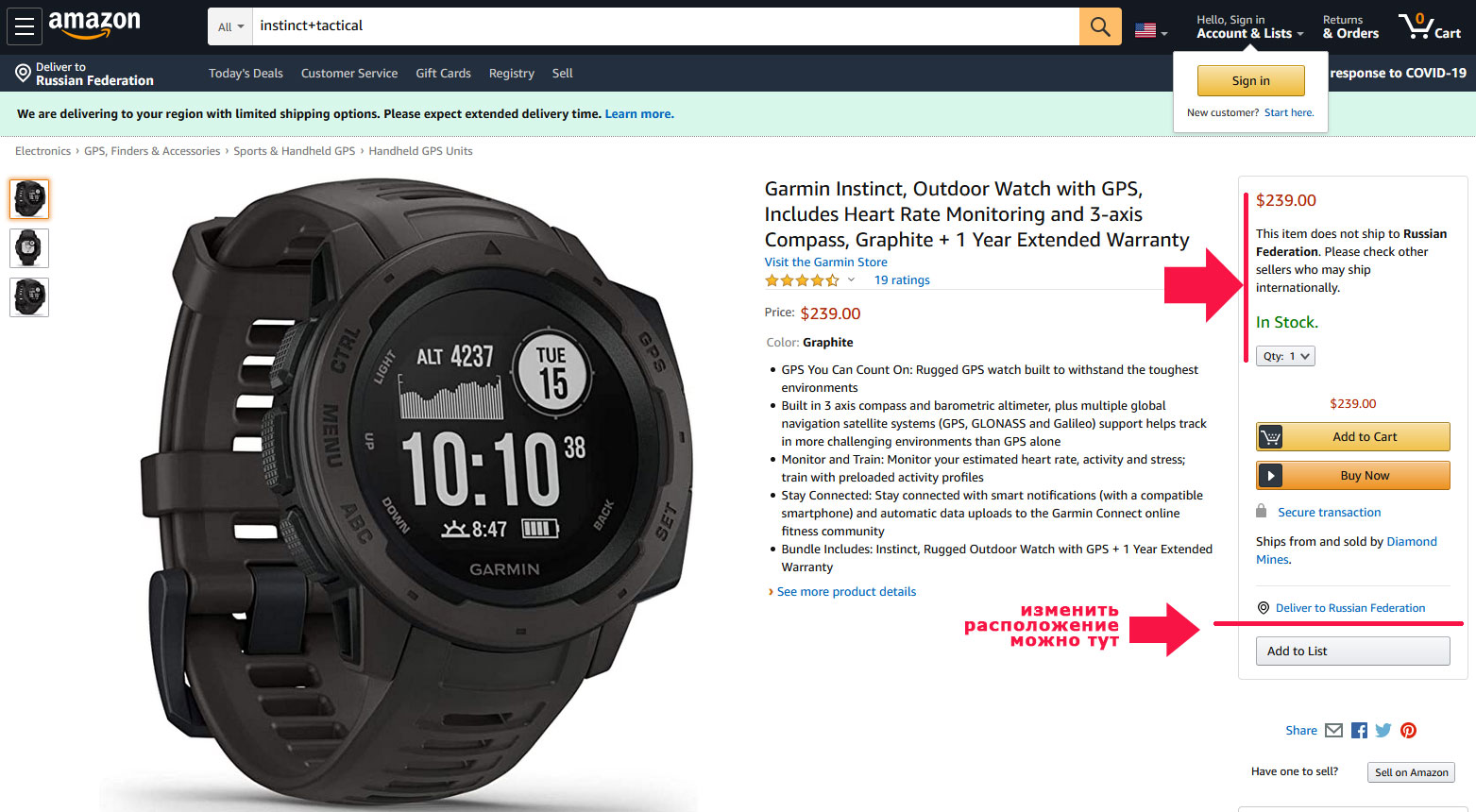 Контролируйте доставку — проверяйте, чтобы в вашей учетной записи был правильно указан регион. Амазон будет подсказывать, возможно ли доставка на ваш адрес или нет.