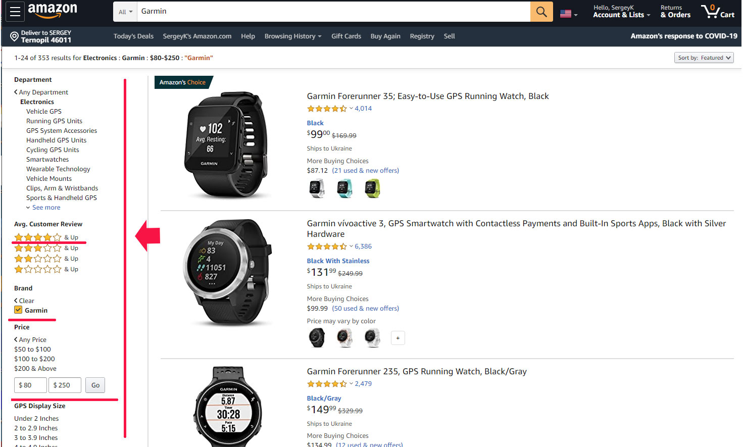 Используйте фильтры — Чтобы быстро найти нужную модель часов Garmin на Амазон используется расширенный фильтр Amazon. Он находится с левой стороны каталога.