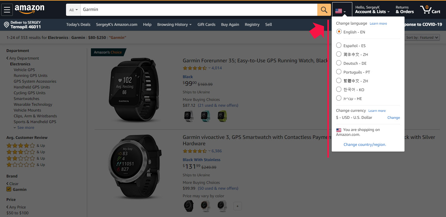 Меняйте регион Amazon — Если вы хотите, чтобы ваш купленный гаджет быстрее пришел к вам и хотите сэкономить на доставке — пробуйте поискать нужный товар на ближайших к вам регионам каталога. Это может быть следующие страны: Испания, Португалия, Германия или другие страны. Используйте внизу выпадающего меню опцию «Change country/region».