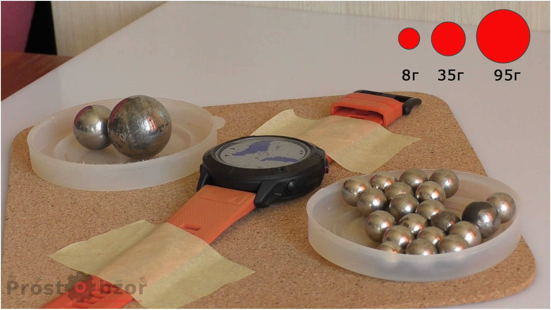 Когда в бой вступила «тяжелая артиллерия» — это шарики весом в 35 грамм и 95 грамм защитное стекло часов сразу же разрушилось, но при этом тестовая поверхность часов не повредилась.