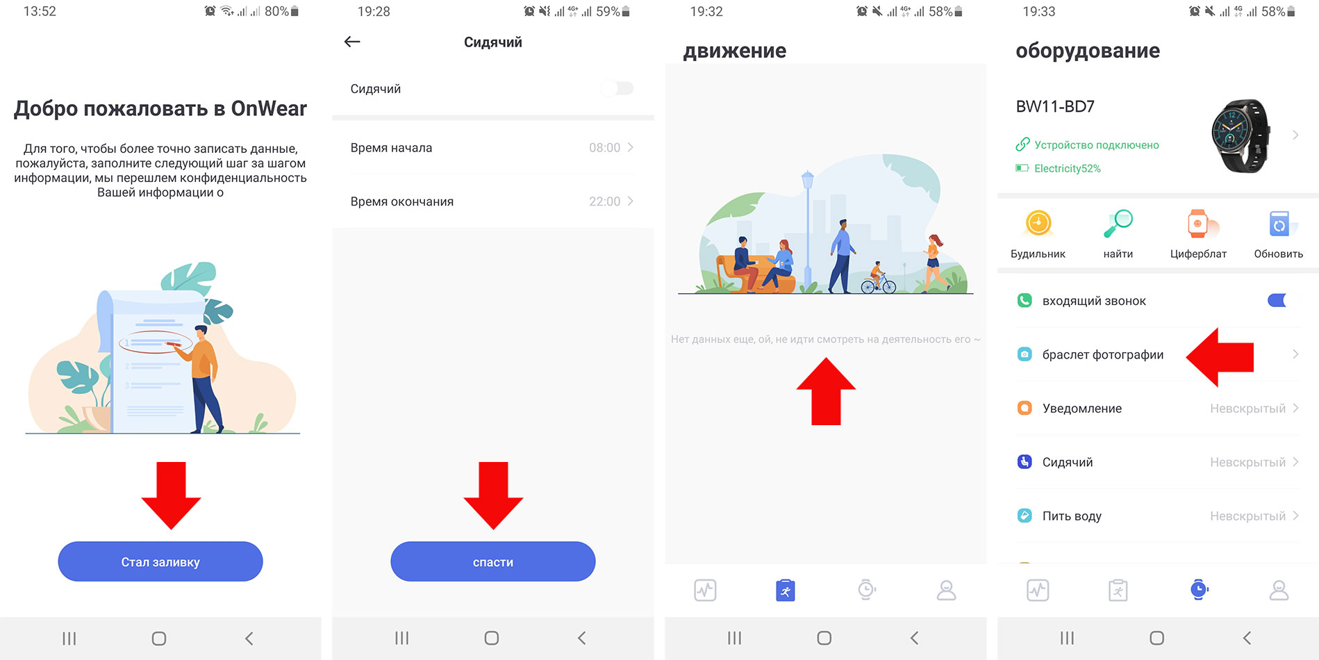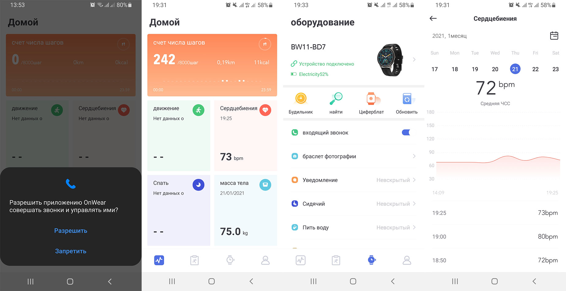 Программа в телефоне OnWear состоит их несколько секций: