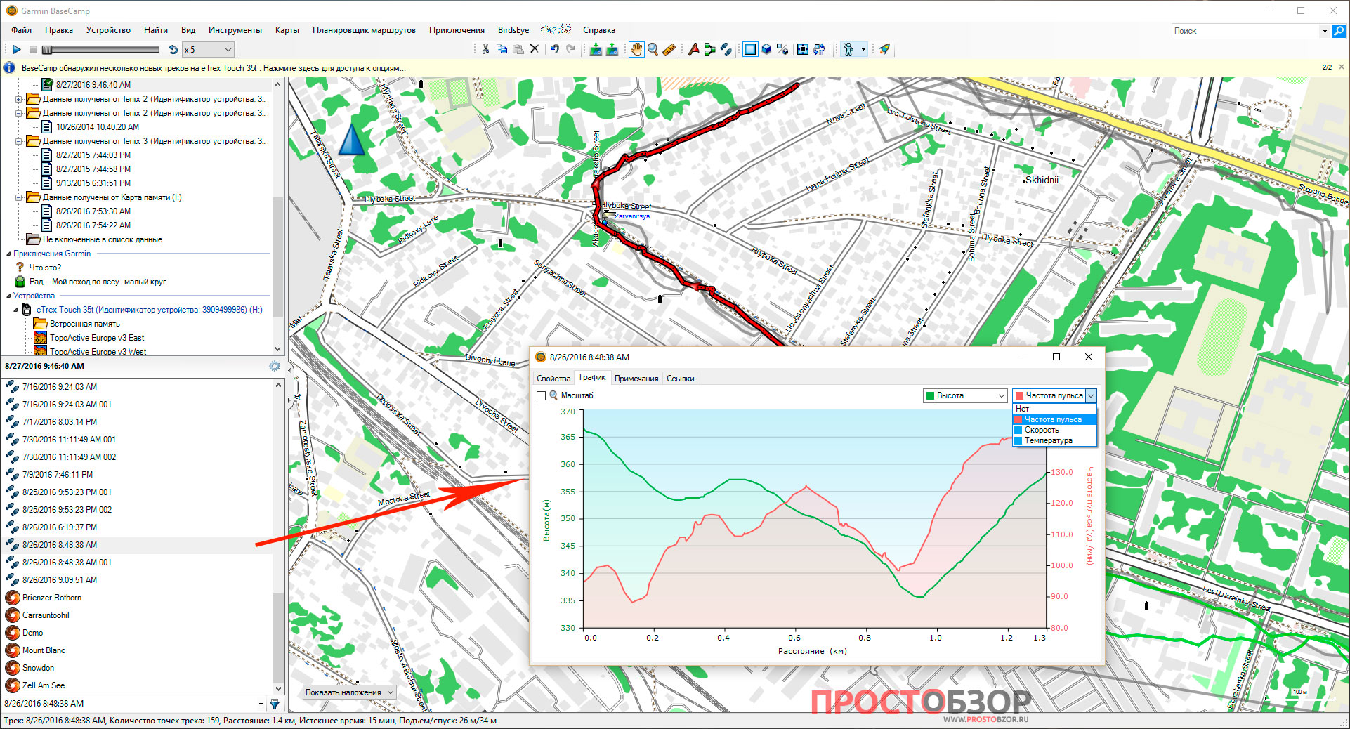Чтобы посмотреть и наложить график пульса и температуры вам нужно загрузить трек в программу Garmin BaseCamp и выбрать нужную секцию, чтобы посмотреть ваш маршрут на карте.