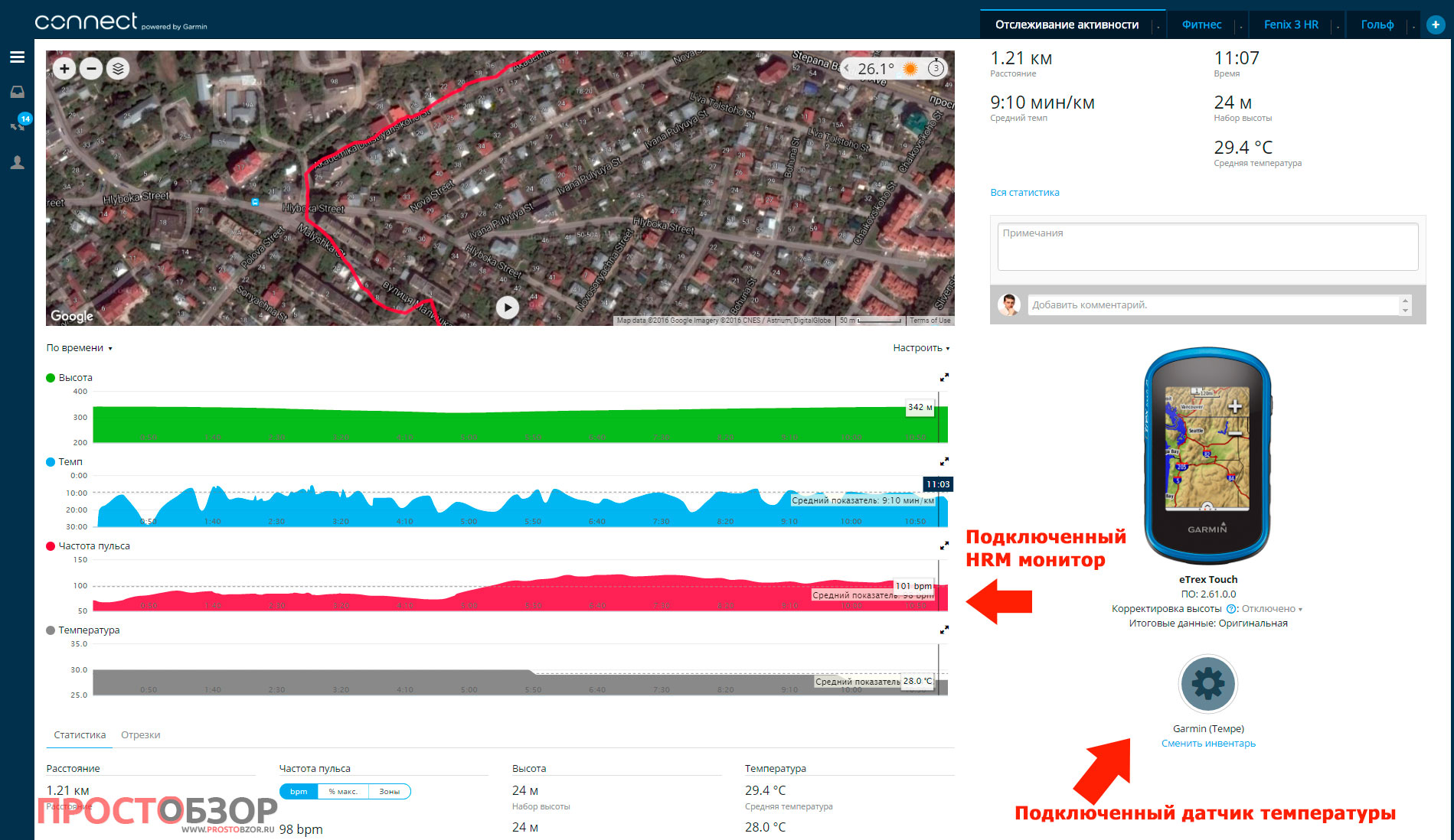 Когда вы сбрасываете данные (синхронизируете) с программой Garmin Express вы сможете посмотреть пульс, температуру, высоту на одном экране, при подключенном HRM кардио-мониторе. Конечно, если вы предварительно подключили нужные датчики для записи вашей активности.