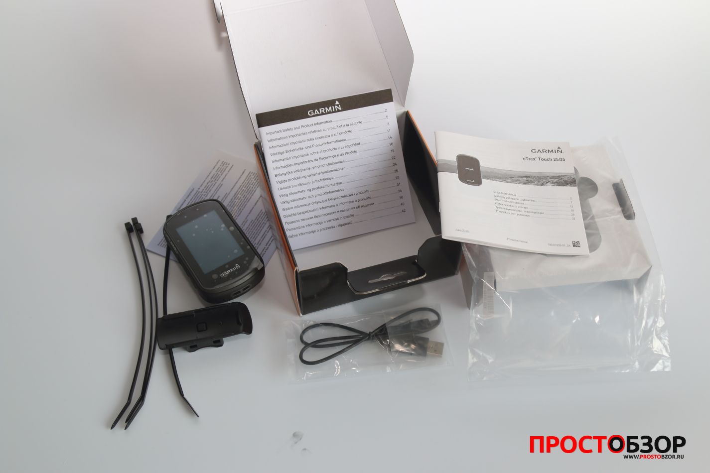 Давайте посмотрим что находится в коробке. Какую комплектацию предлагает Garmin для GPS навигатора eTrex Touch 35?