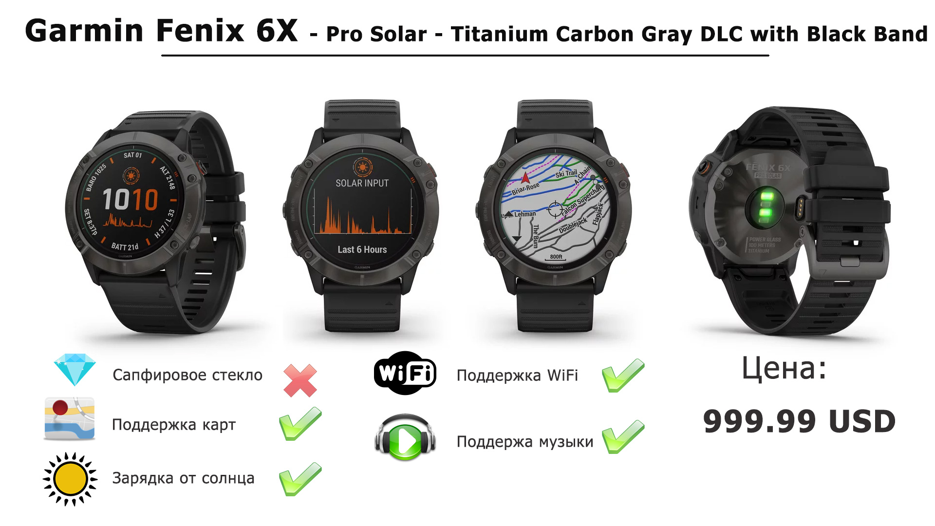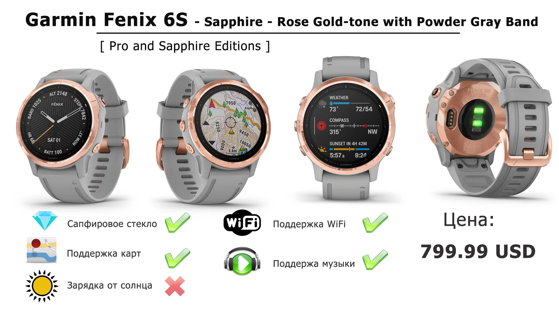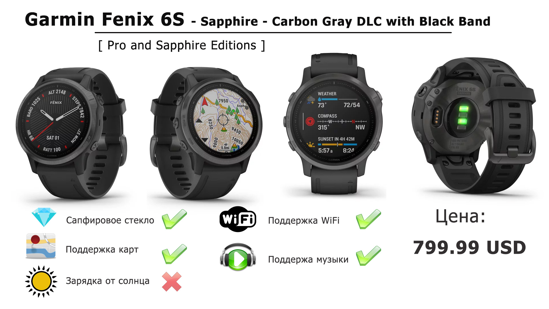 Sapphire – Сапфировое стекло, поддержка всех карт, 32 Гб памяти, музыкальный плеер, зарядки от Солнца в часах НЕТ.