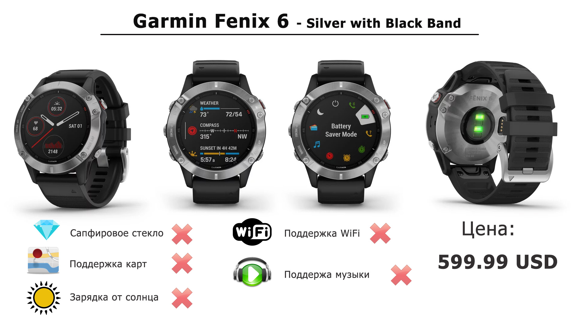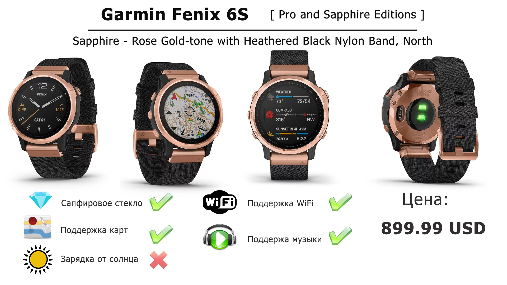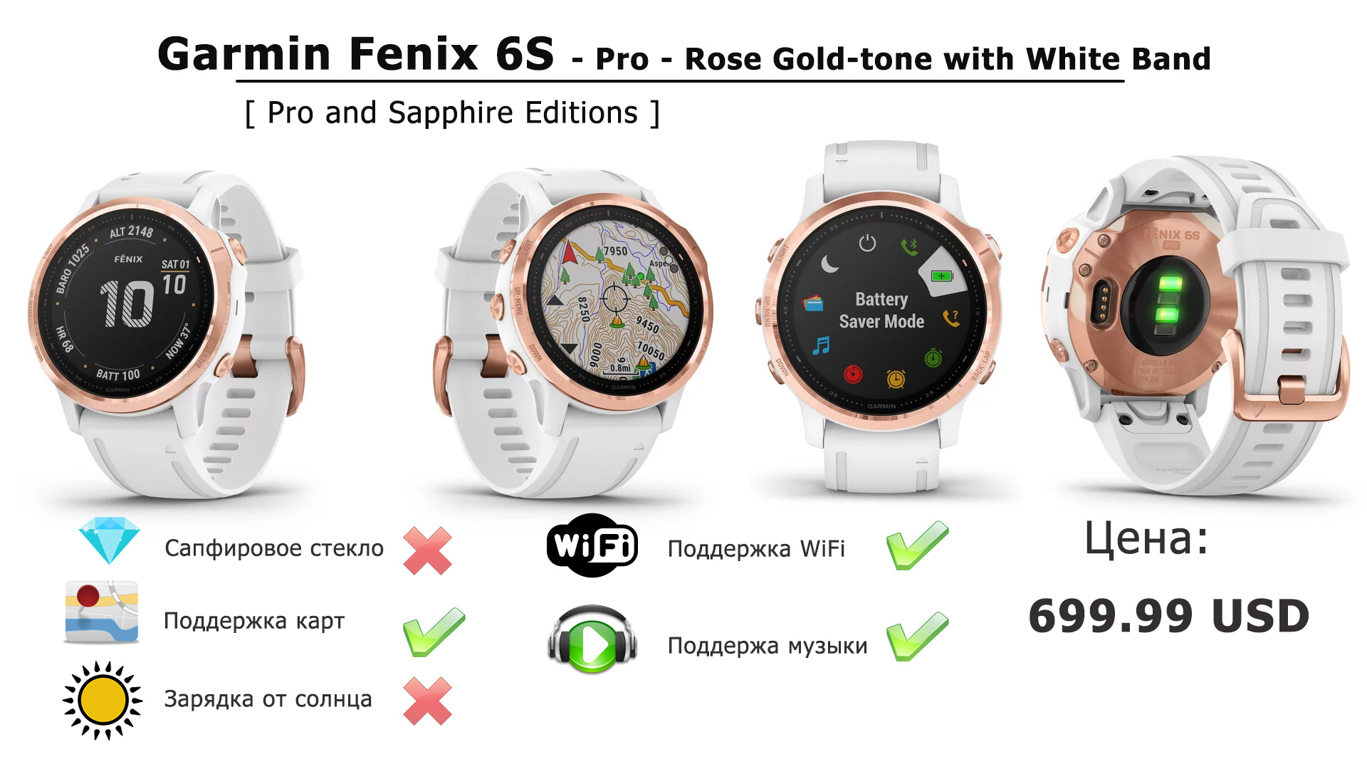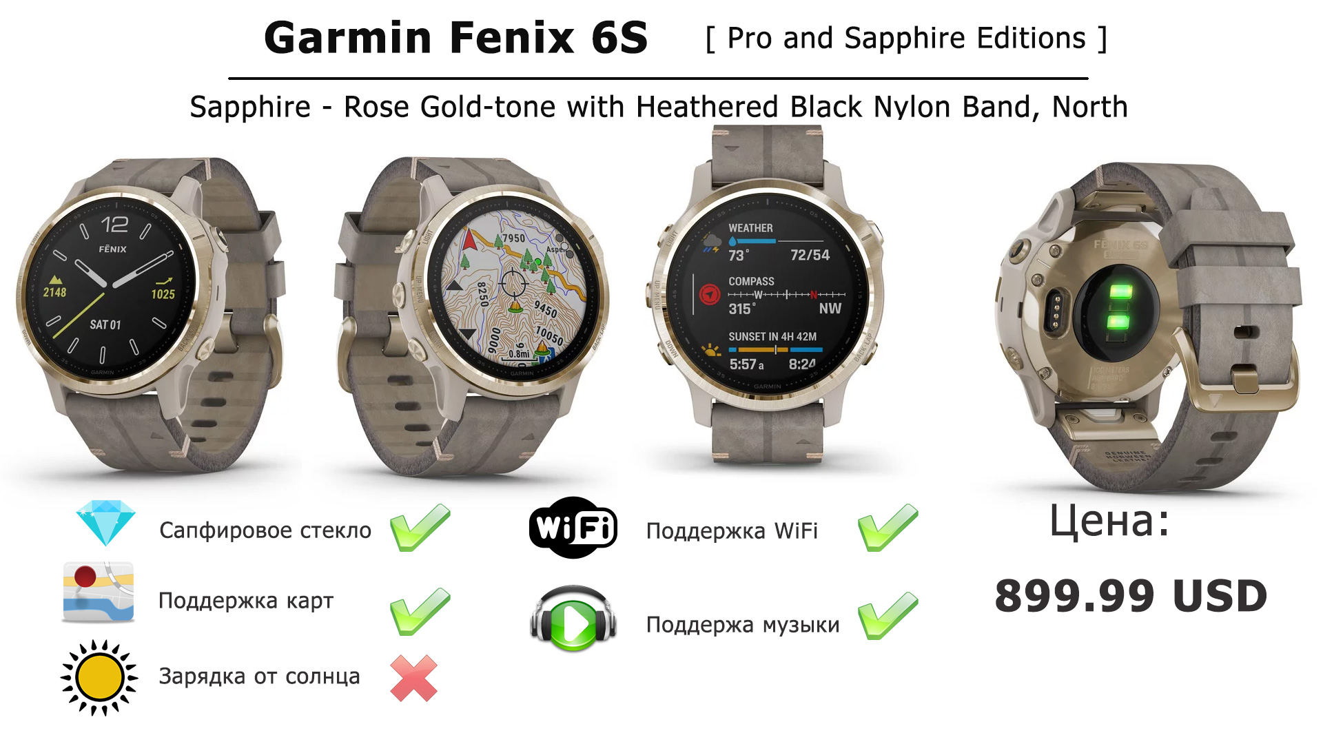 Sapphire – Сапфировое стекло, поддержка всех карт, 32 Гб памяти, музыкальный плеер, зарядки от Солнца в часах НЕТ.