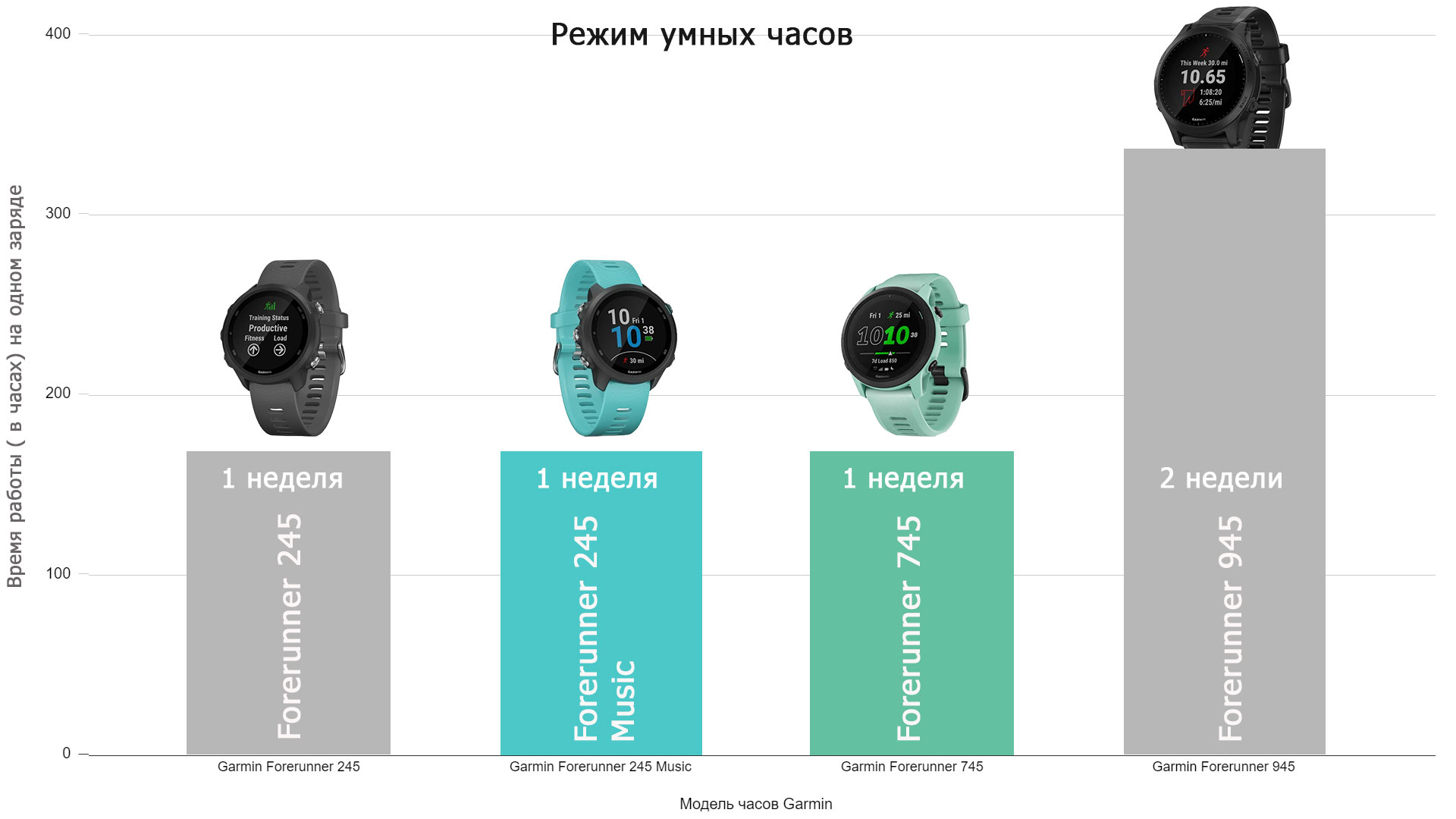 Из всех сравниваемых моделей безусловным лидером по длительности работы аккумулятора является Forerunner 945.
