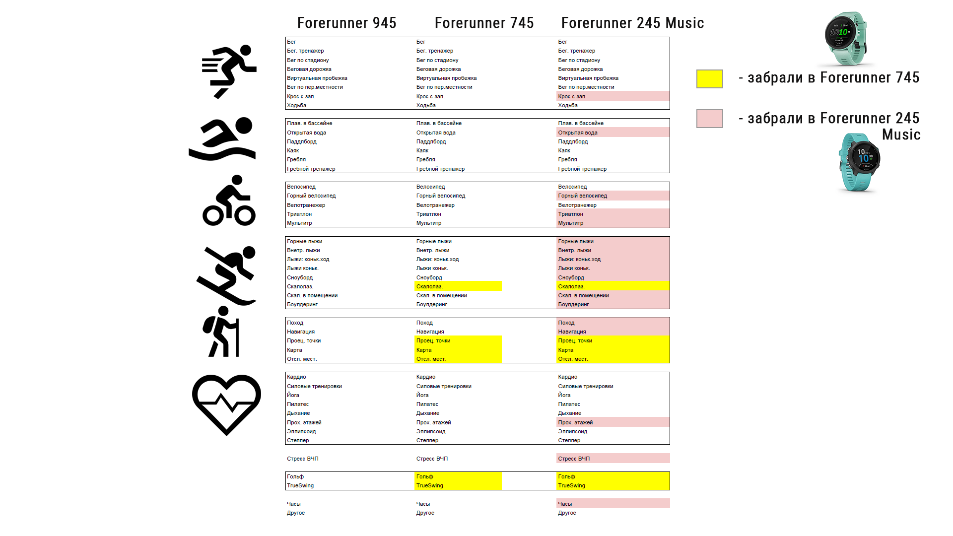 Более дешевая модель Forerunner 745 поддерживает активности триатлон, так что в ней абсолютно все те же кардио-ремни, как и у Forerunner 945.