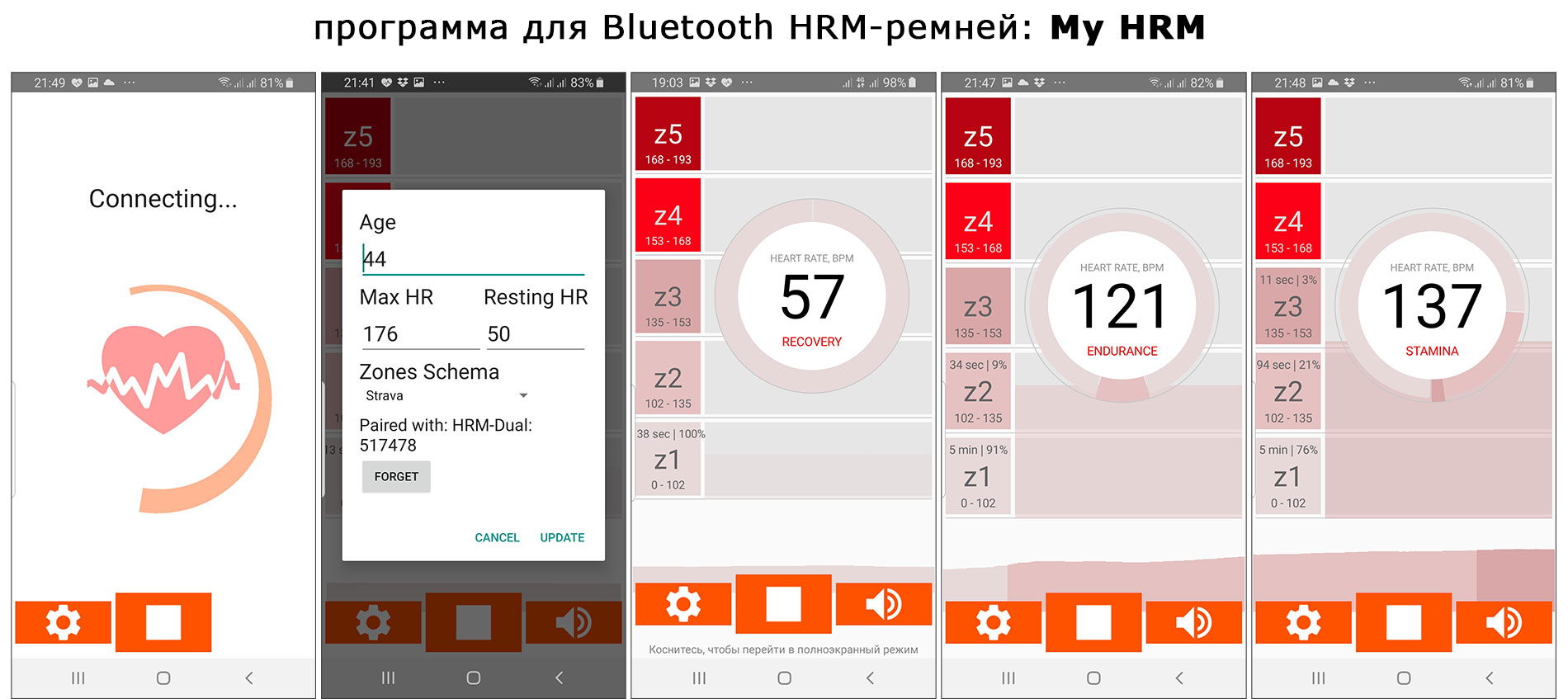 Из минусов программы — нет режима «поверх окон». Не забудьте установить в настройках свои данные (год рождения, вес), иначе программа пробует установить зоны для людей 2000 года рождения :-).