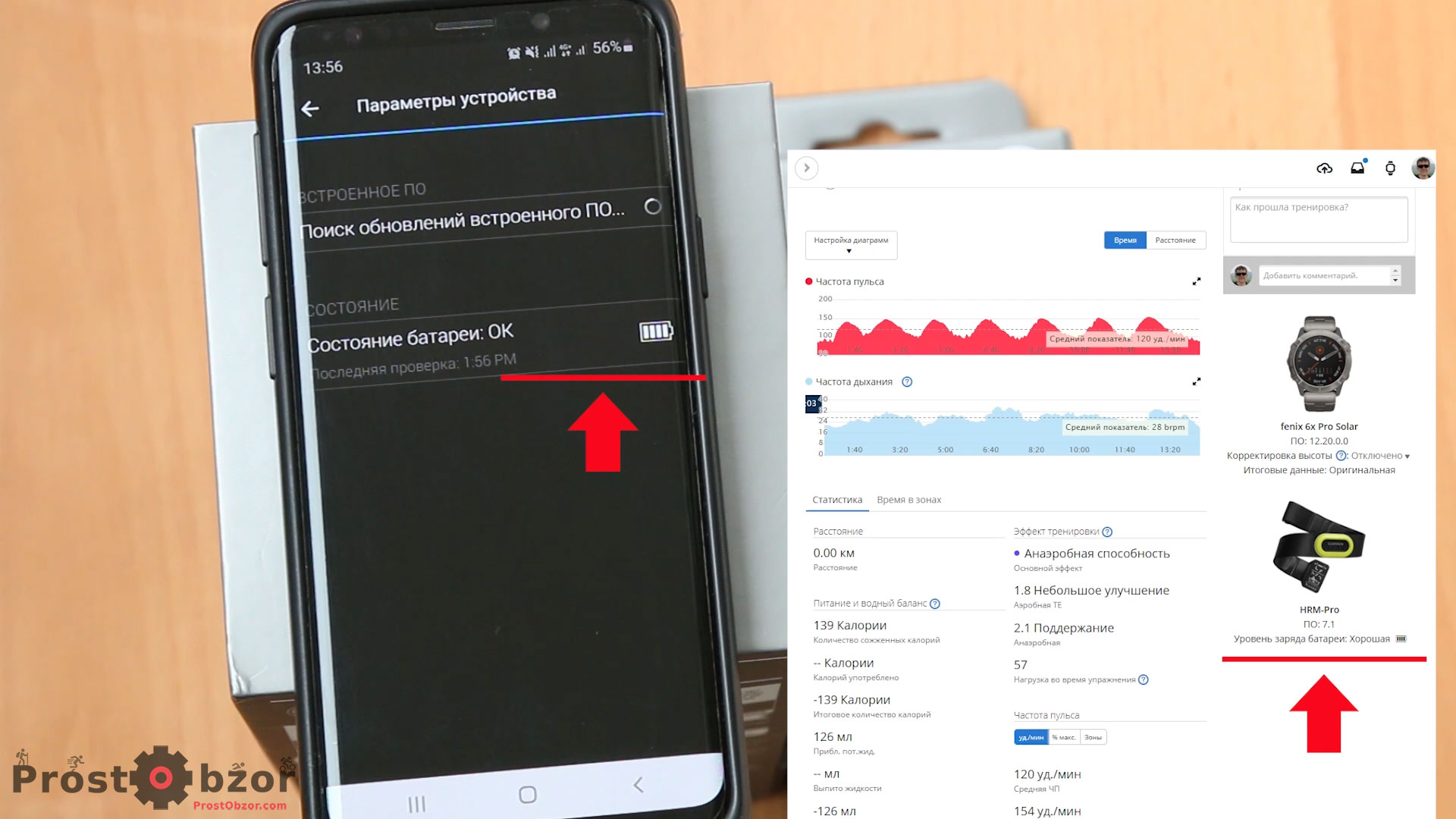 Уровень заряда батареи доступен в программе Garmin Connect — “Устройства” -> “HRM-Pro” -> “Общие”