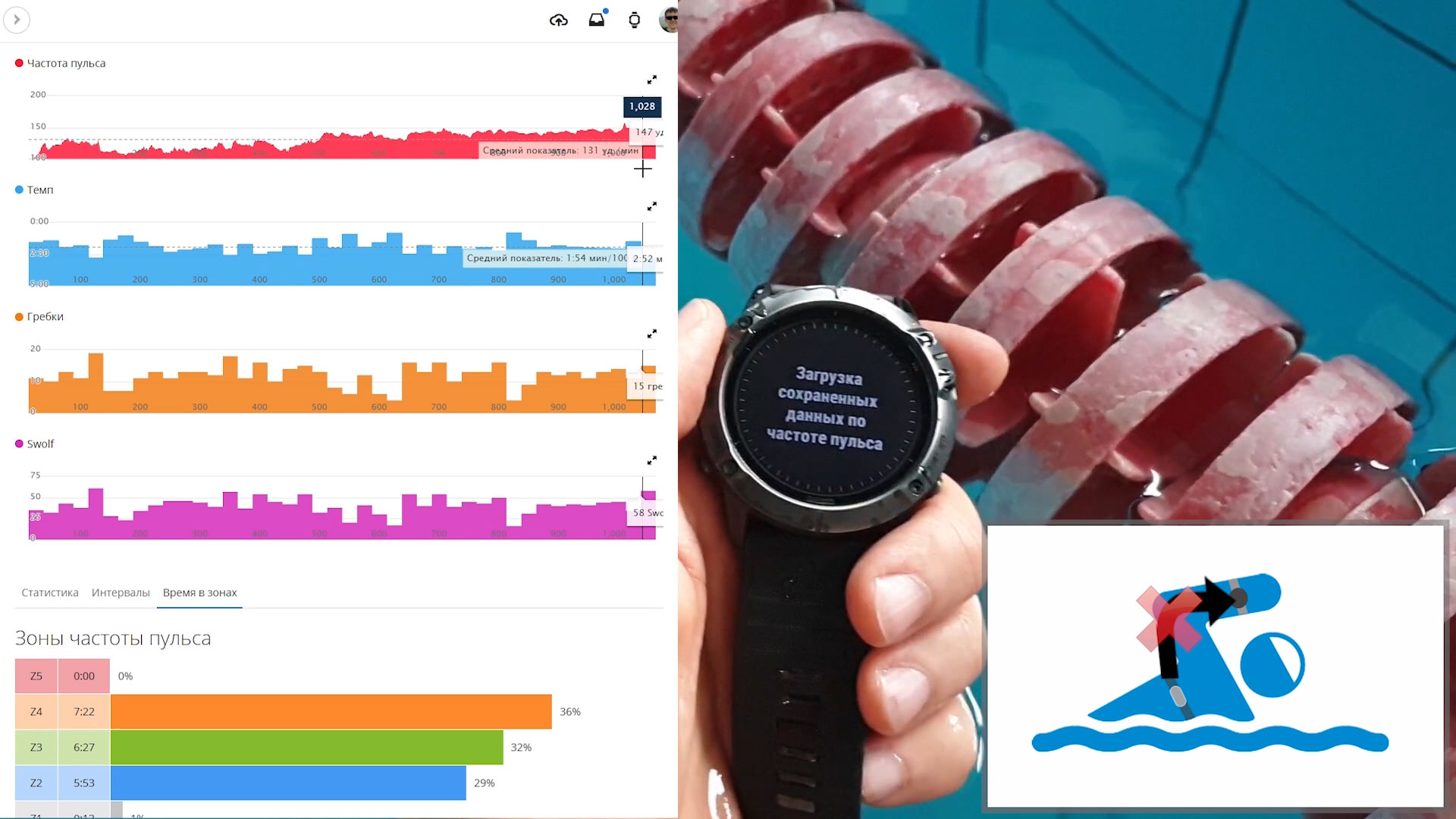 Вы начали заплыв с часами или ремнем — кардиопульсометр записывает и сохраняет только пульс при заплыве.