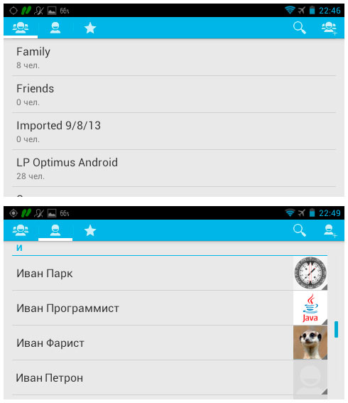 «Контакты» — типичные контакты от Google. Можете добавлять информацию по владельцу, создавать группы, добавлять телефоны, е-мейлы, адрес и другую информацию.