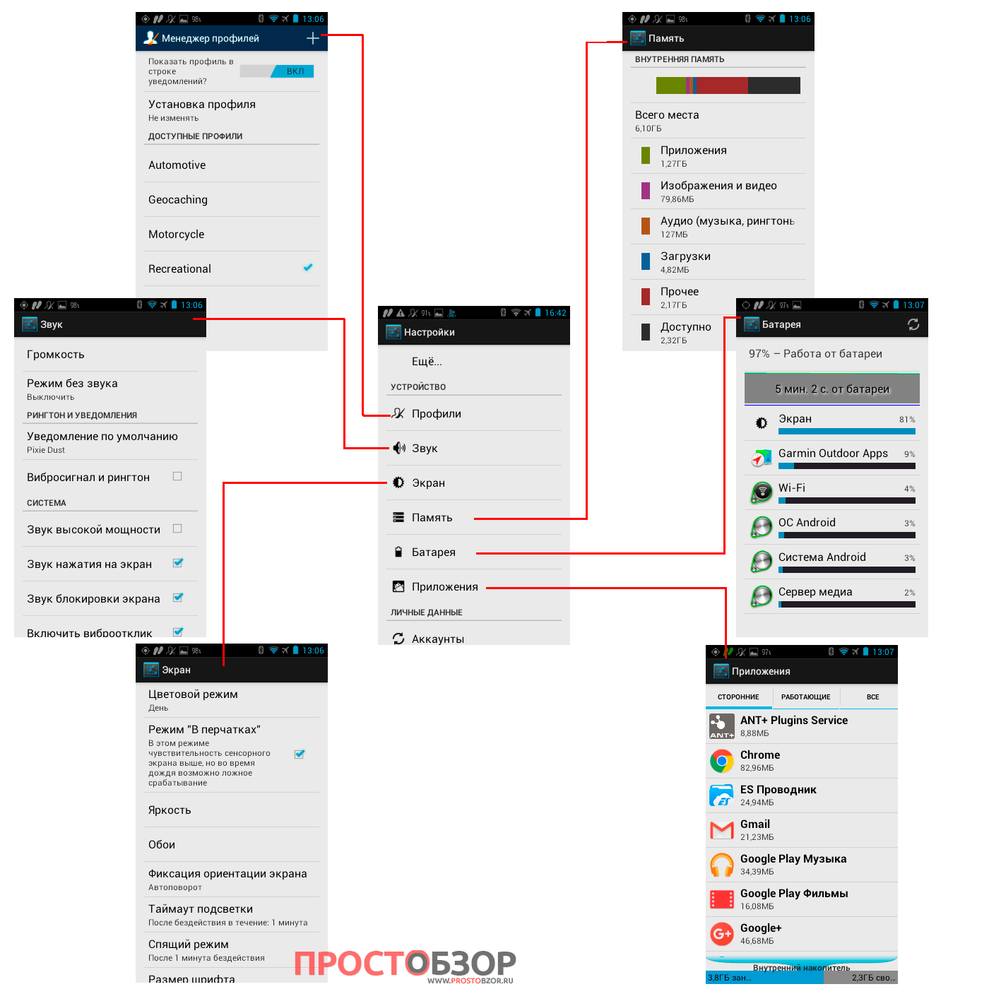 Включает в себя: профили, звук, экран, память, батарею, приложения