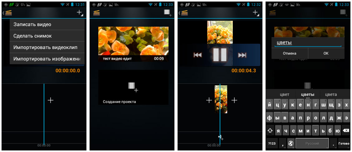 Вы можете редактировать видео и фото. Сразу же можете снять видео налету и тут же начать с ним работать или импортировать уже снятый материал для работы.