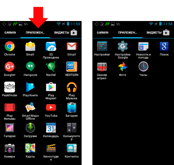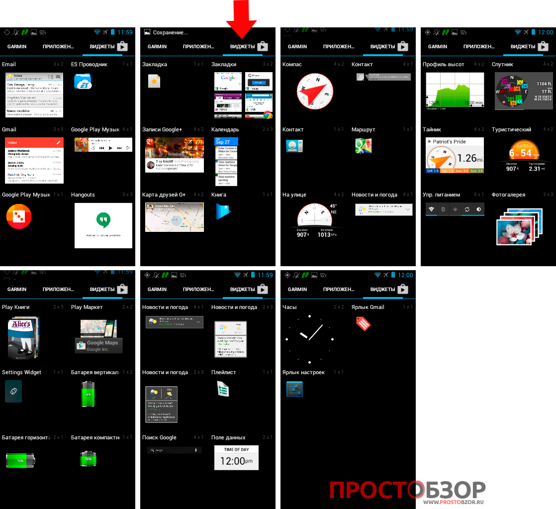 Виджет заряда аккумулятора и «ES Проводник» появились тут, когда я установил 2 приложения с Google Play Маркет. Все остальные уже были тут, а именно: виджеты, связанные с Google: почта, музыка, книга, видео, коммуникации и мессенджеры, карты.
