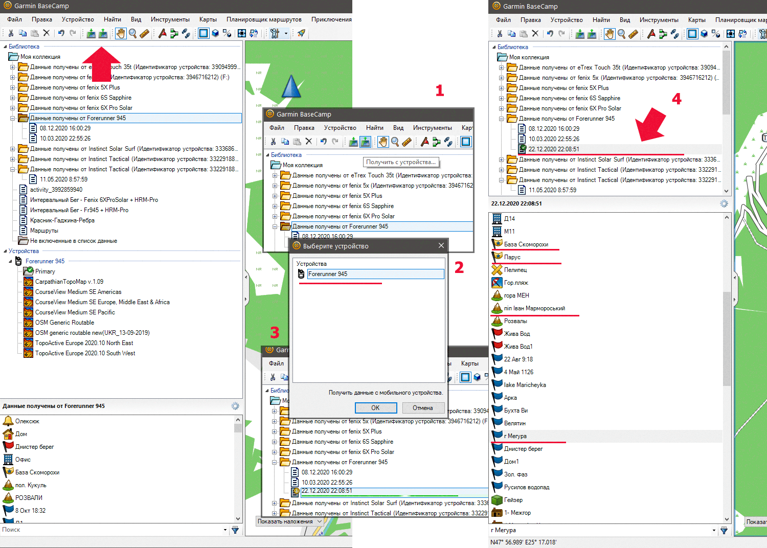 - Подключили старые часы по USB кабелю к ПК и загрузили все точки и треки в папку Garmin BaseCamp.