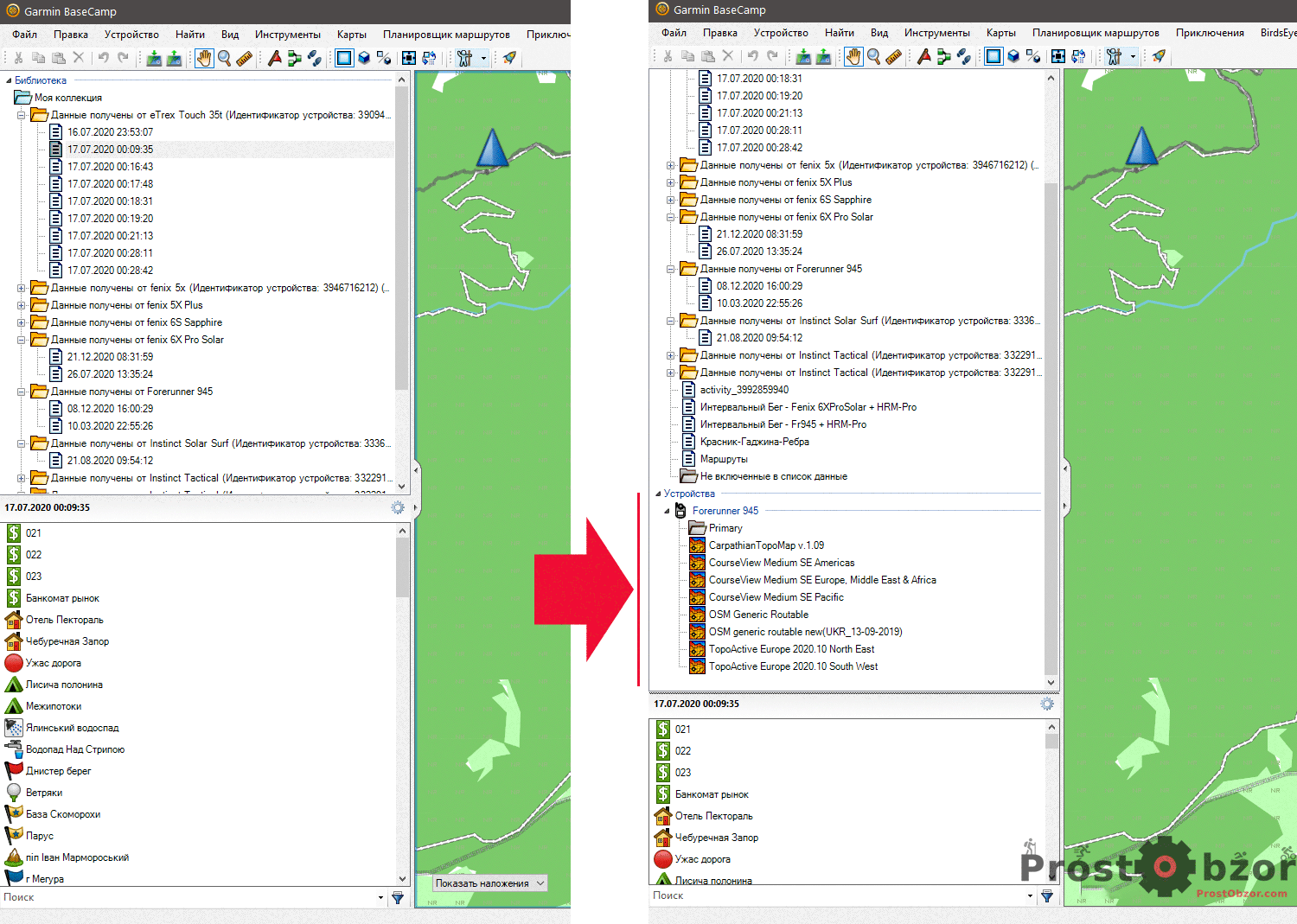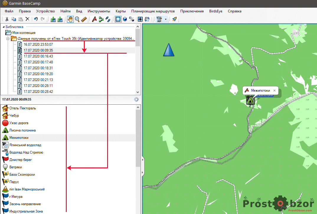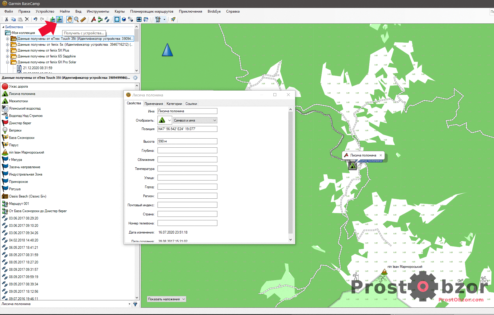 После получения данных с Garmin устройства все ваши сохраненные точки и маршруты будут показываться с названием даты загрузки данных с устройства в отдельной папке.