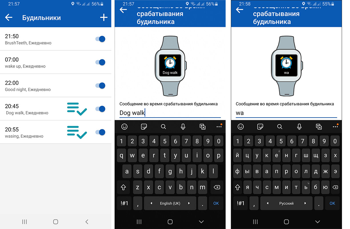 Приходится использовать английские буквы для будильника, хотя установка целей позволяет добавить русские фразы и буквы без проблем.