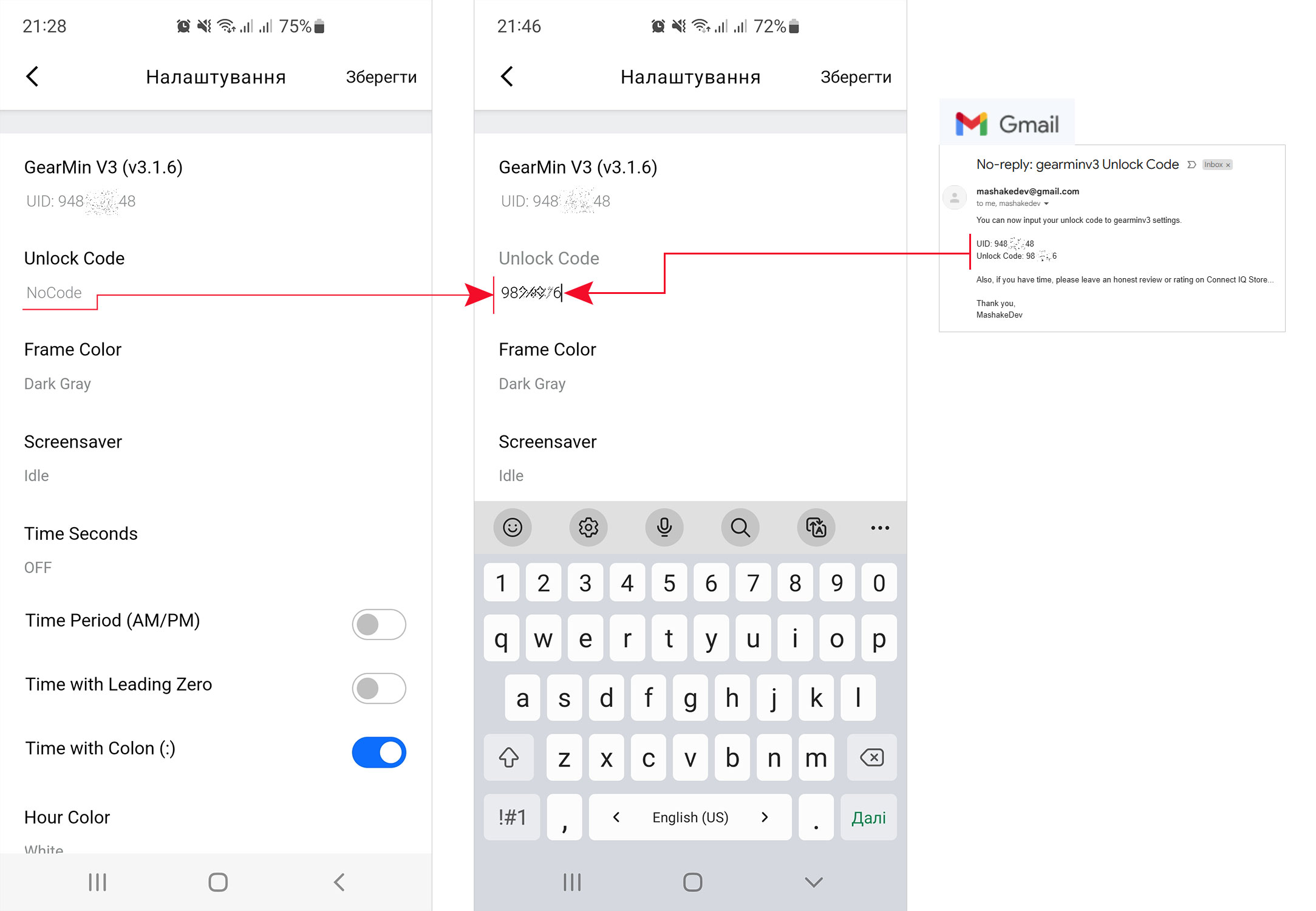 На странице автора циферблата — перейдите на его страничку и укажите ваш емейл и код устройства.