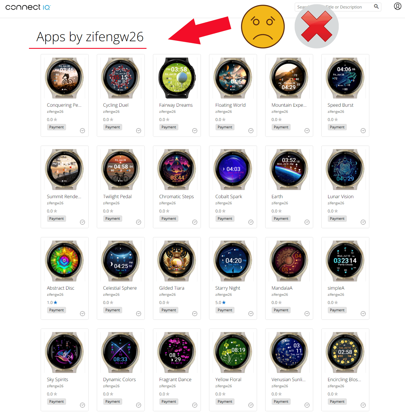 У правильных авторов циферблатов — есть имя, есть платные и бесплатные циферблаты и большое количество загрузок для каждого циферблата.