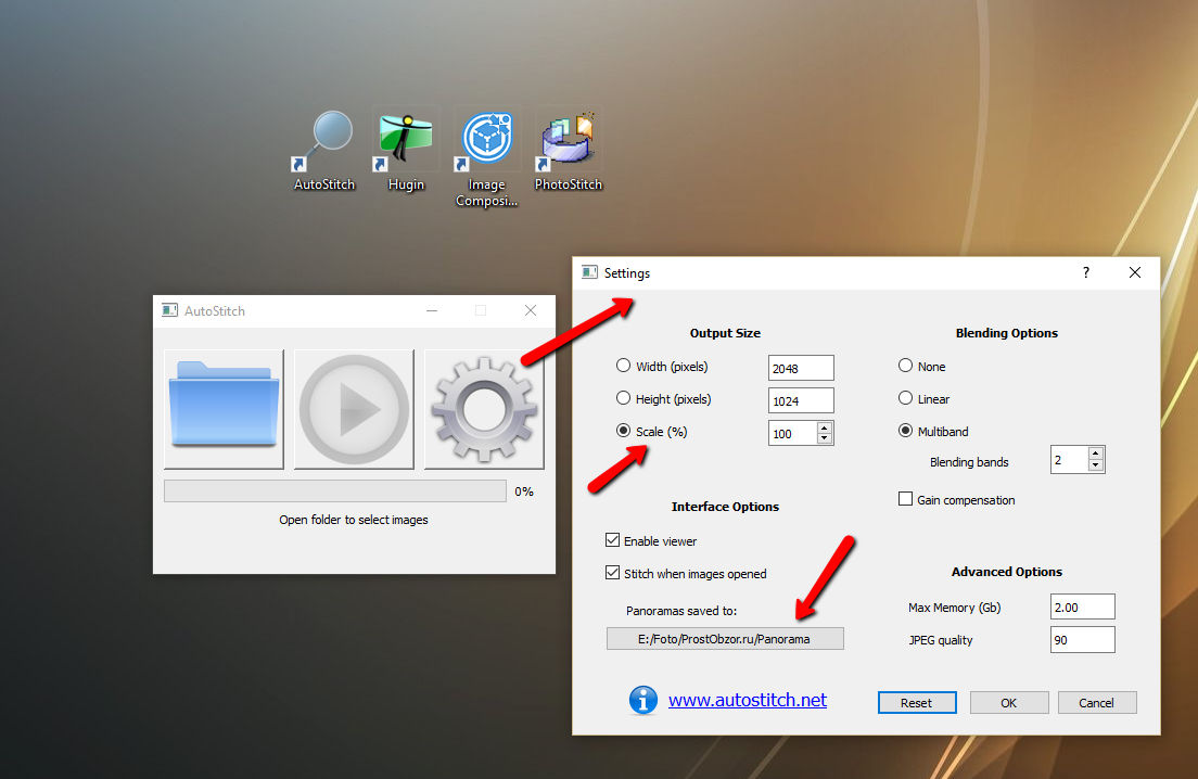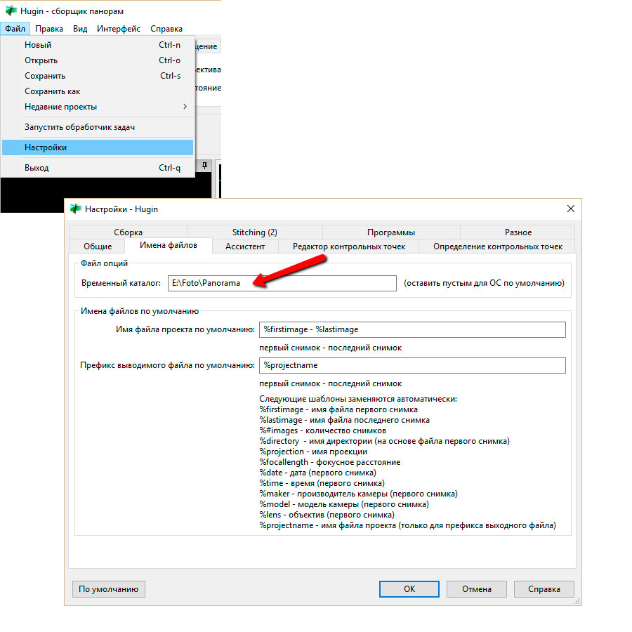 Шаг 2 — Устанавливаем настройки создания панорамы с помощью Hugin — папку для сохранения, название файлов и т.п. Настроек много, так что держитесь 🙂