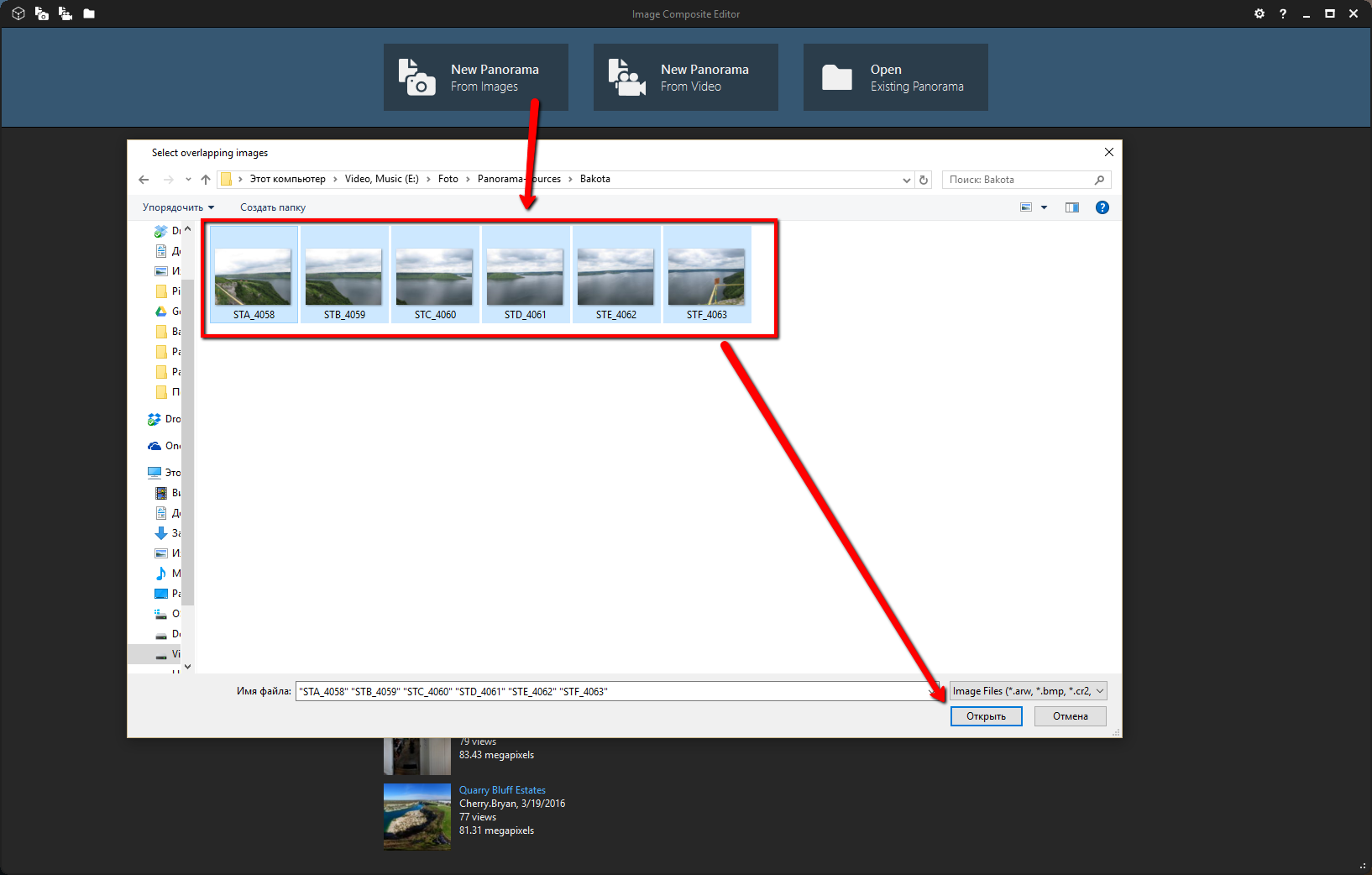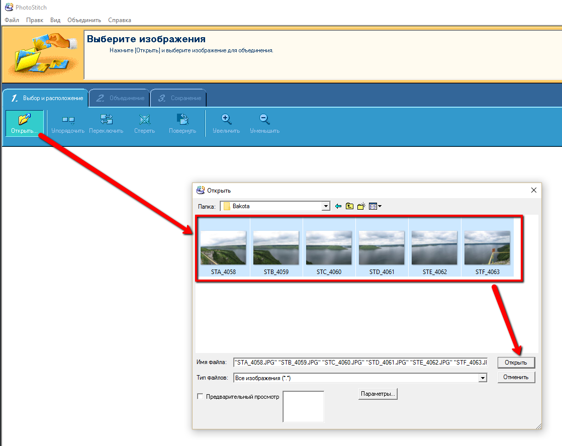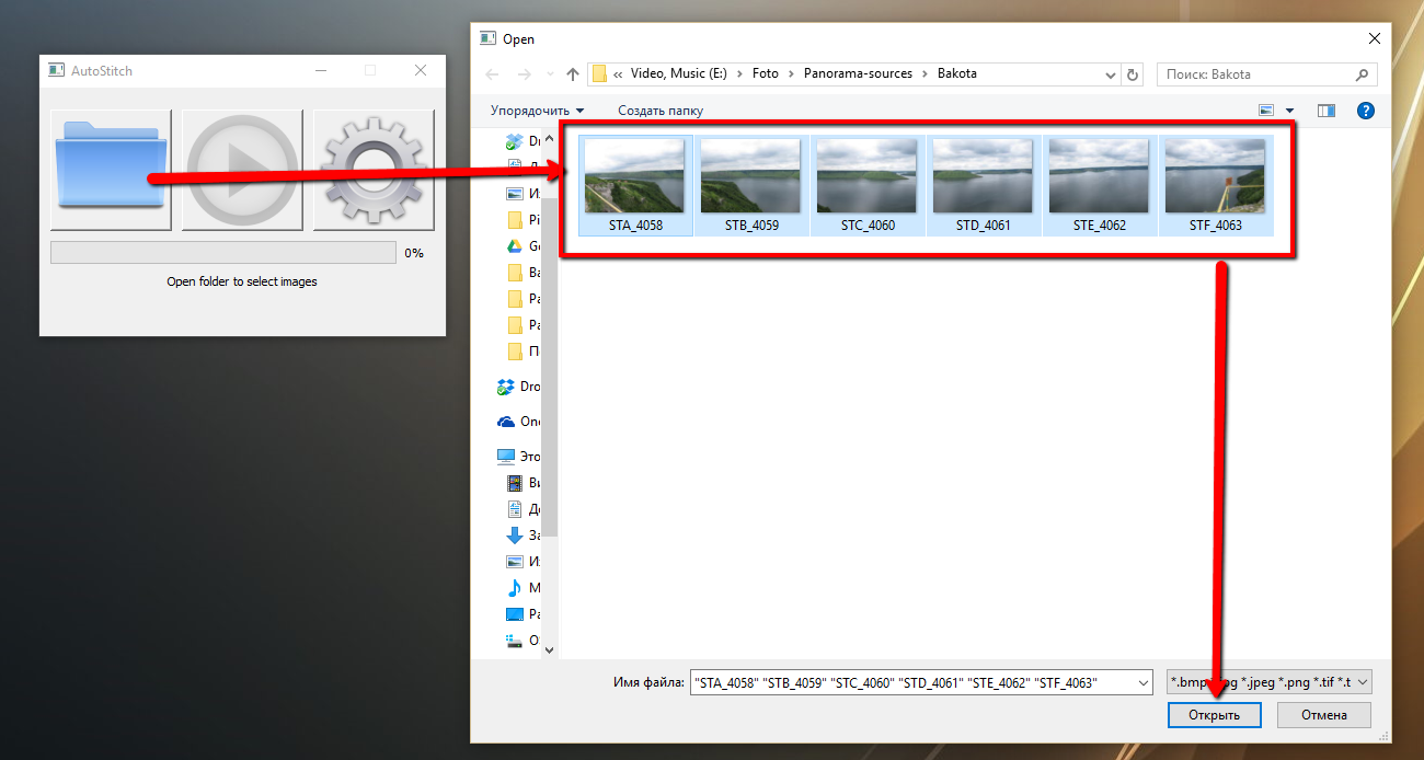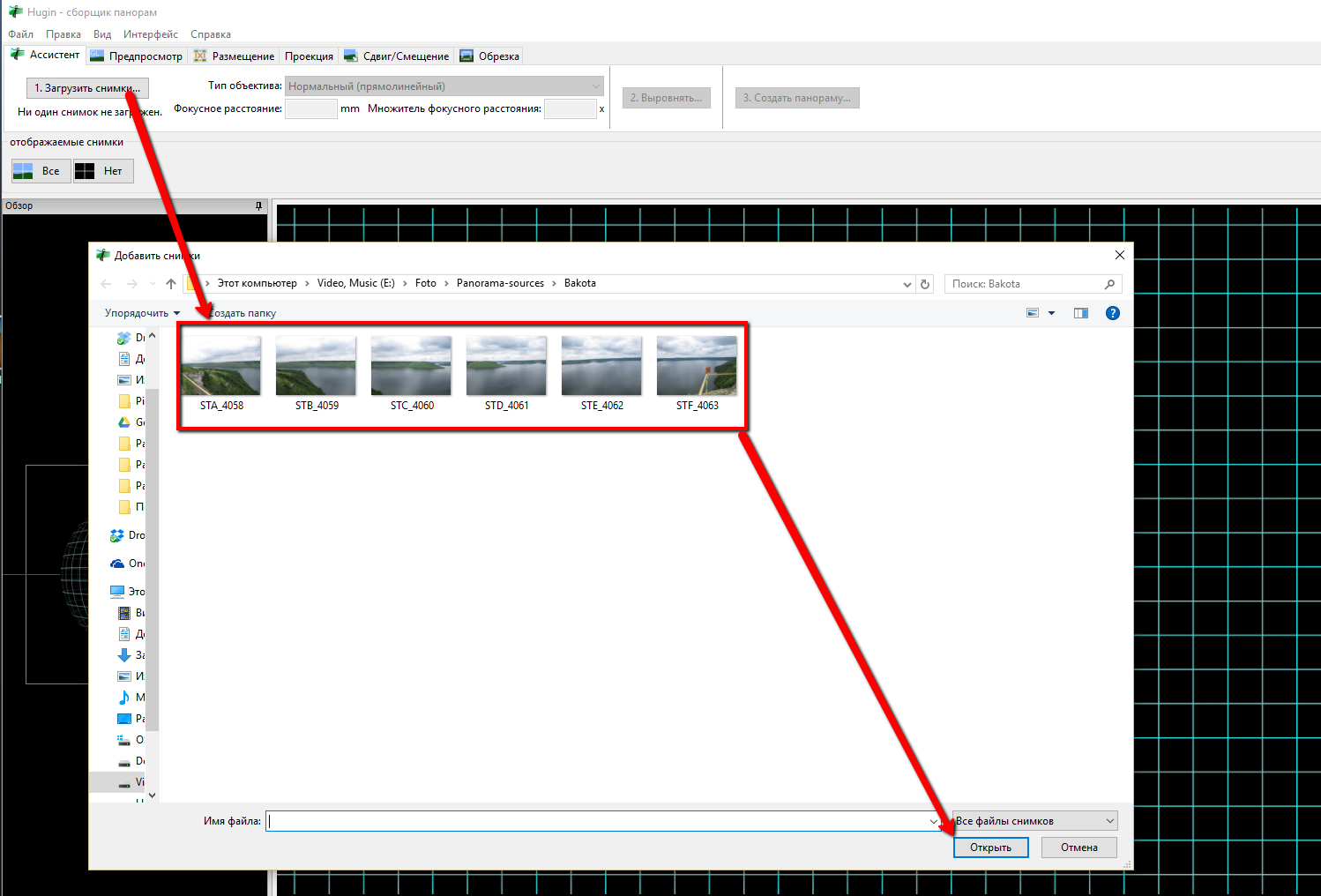 Шаг 2 — выбираем фотографии из которых будет создаваться панорама.