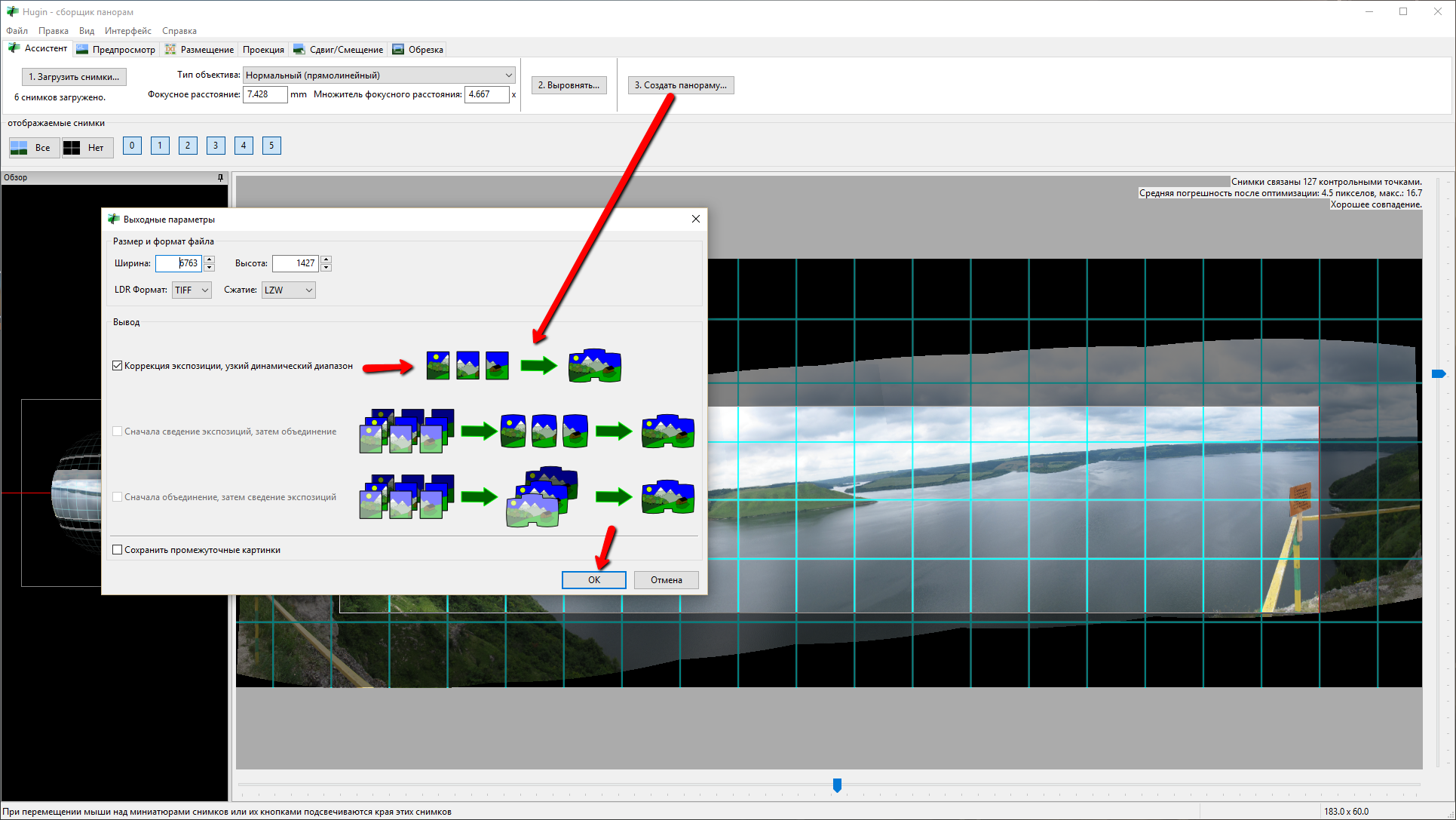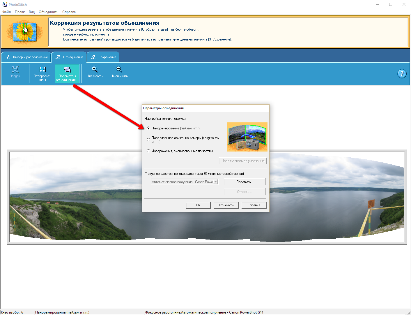 Шаг 4 — Выбираете настройки генерации панорамы (программа предлагает выбор из возможных вариантов)
