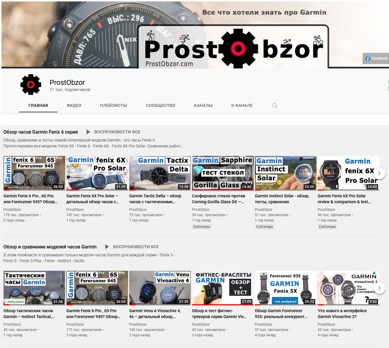 YouTube Канал Prostobzor – це 110 відео оглядів про годинники, навігатори, датчики, прилади Garmin. Тут же відео інструкції по роботі з годинником, даними, картами, точками, спортивними активностями.