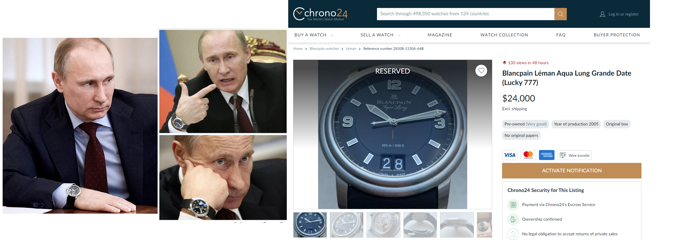 Вместо этого у него красуется иностранная марка часов Blancpain Grande Date Aqua Lung.
