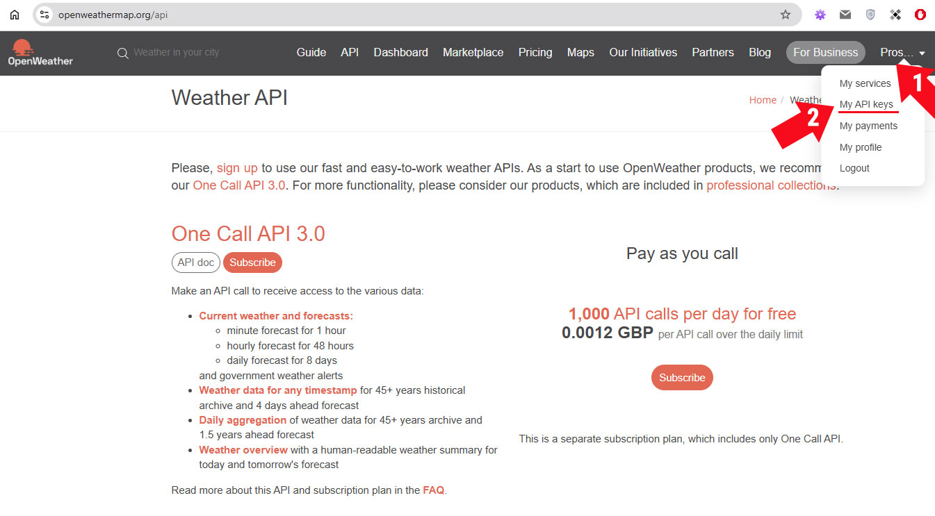 Зайдите на сайт Прогноза погоды — openweathermap.org и откройте в меню «Pross..» в шапке сайта меню.